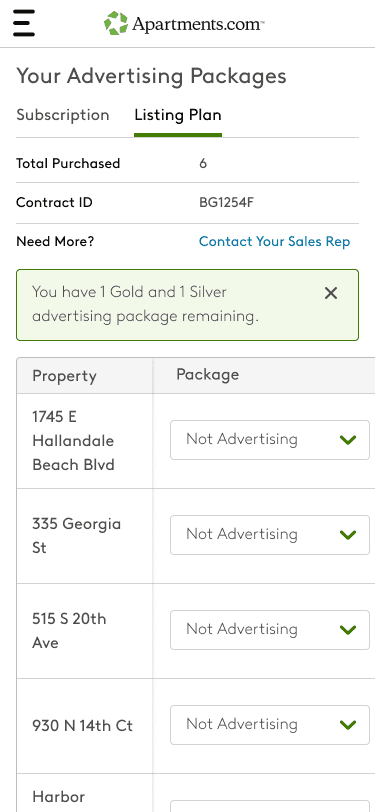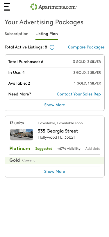 The challenge was to reimagine the subscription model so it could adapt to smaller operations: one that maintained Apartments.com’s business goals while allowing property managers to flex their subscription between multiple listings as availability changed throughout the year.