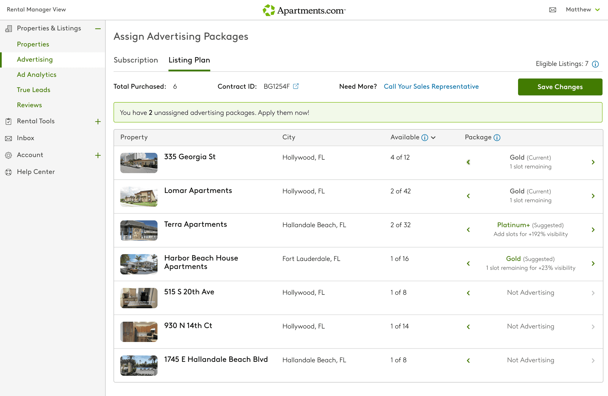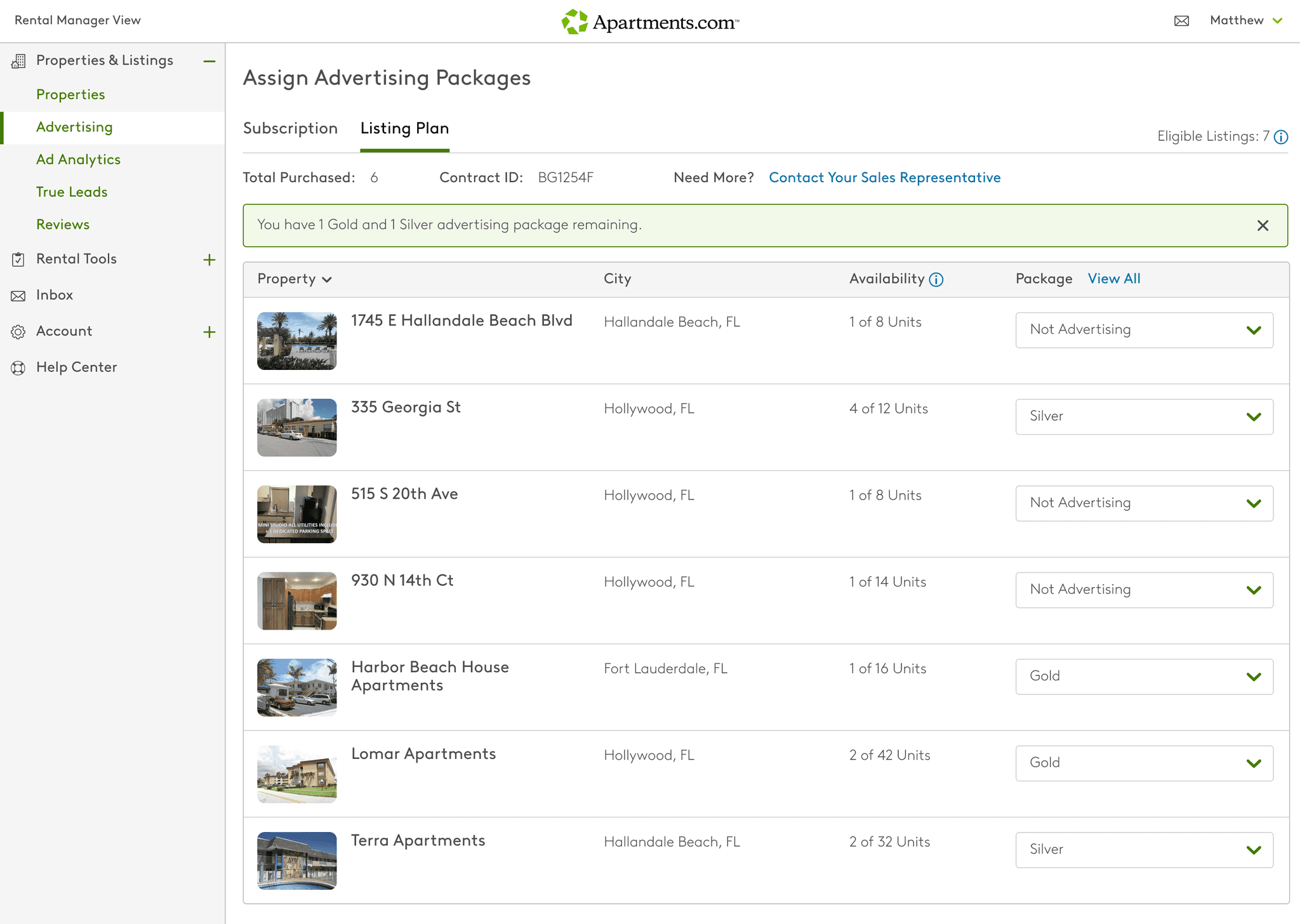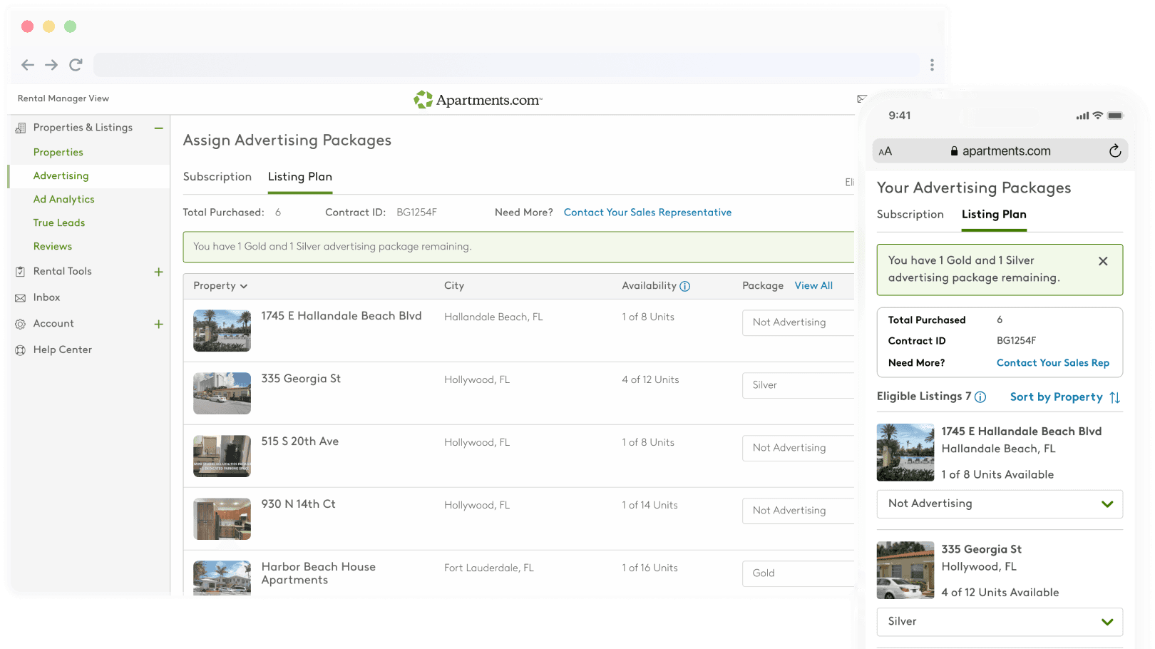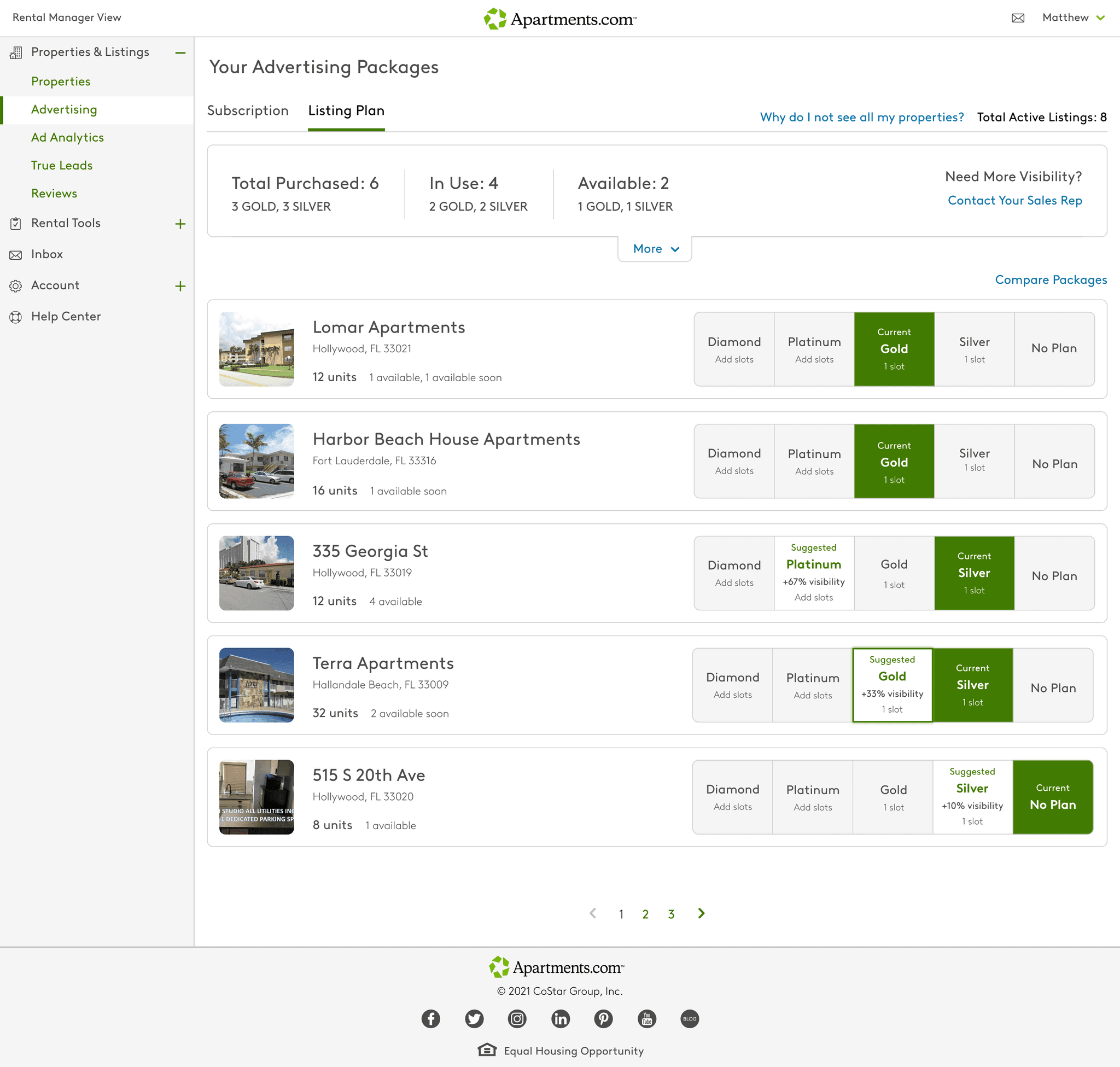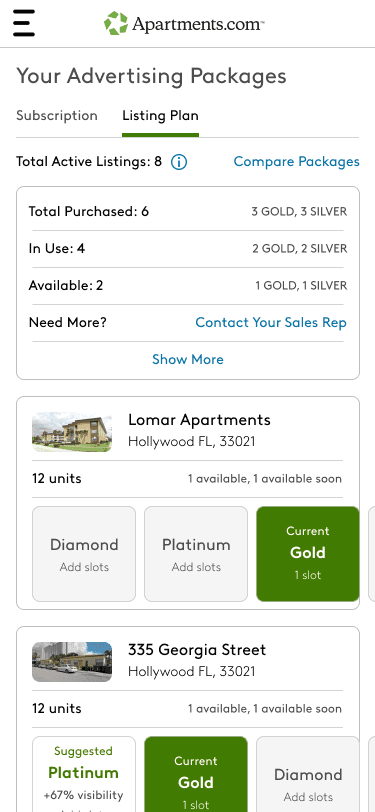 Apartments.com monetized through a tiered advertising model that offered property managers greater visibility and richer listings based on their chosen subscription level. Each plan was tied to a single property for the duration of a year-long commitment, giving larger apartment communities consistent exposure across their many vacancies.