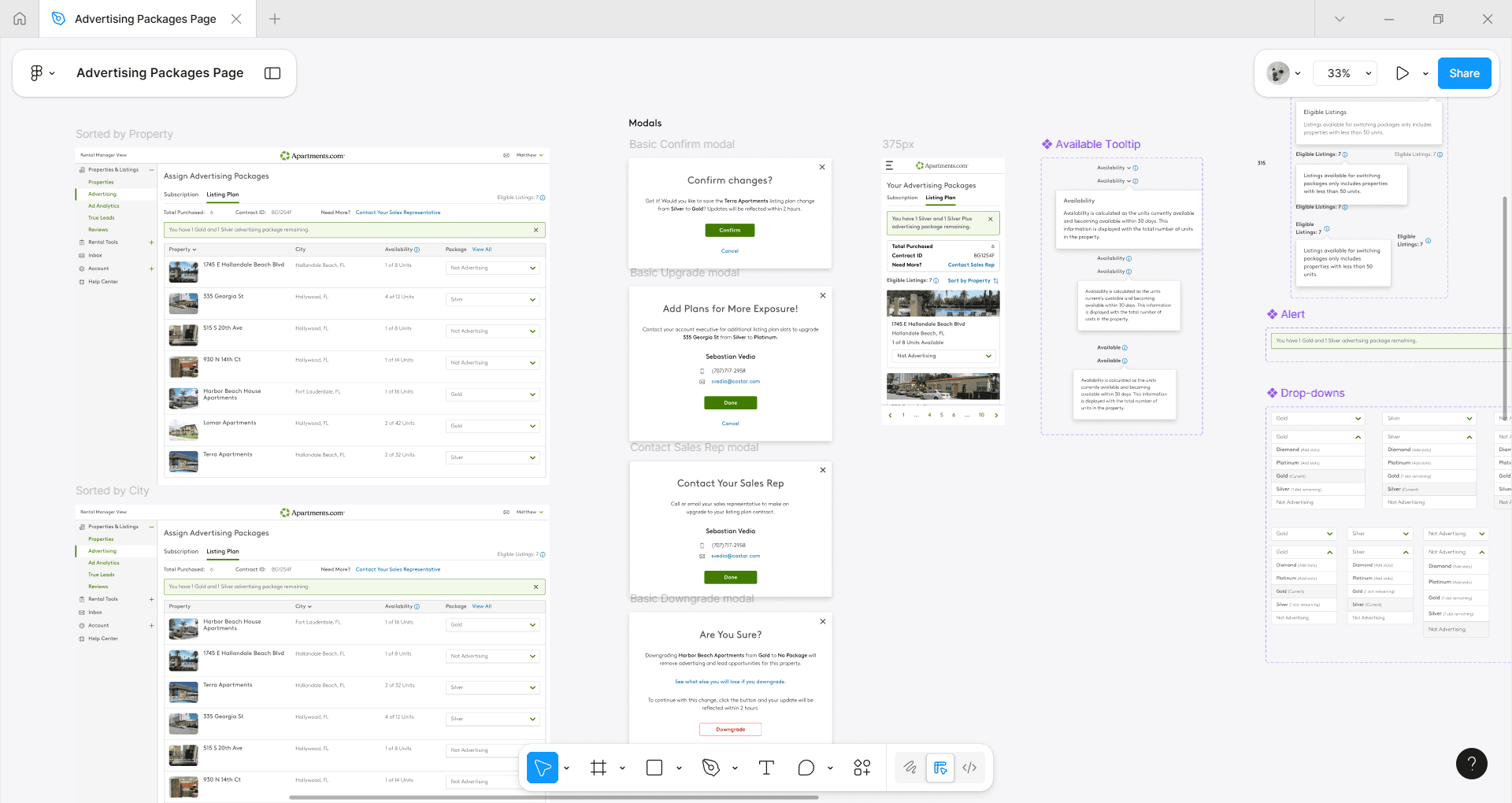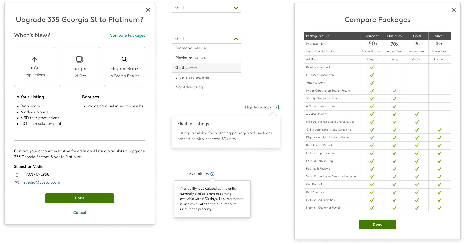 The main goal of this new feature was to inform users about their current subscription level and usage across their property. During the design phase, I spent multiple cycles exploring different ways to display their current advertising contract information, include an easy way to increase their advertising level, and switch packages between eligible properties.